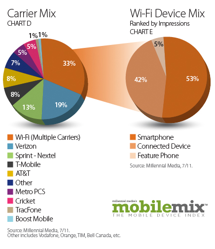 For the first month, Millennial broke out Wi-Fi enabled devices, and in July, Wi-Fi accounted for 33 percent of the Carrier Mix. Within Wi-Fi, Smartphones make up over half of all Wi-Fi impressions on the network and connected devices, including Tablets, gaming devices, and eReaders, accounted for