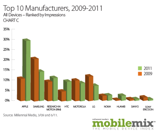 As reported in the company’s SMART report a few weeks ago, manufacturers Apple, HTC, and Huawei all more than doubled their impression share in the past two years thanks to the growing popularity of smartphones. Millennial says that in 2009, its first Top 20 Mobile Phones list featured a mix of feature phones and smartphones, including seven BREW devices, three Java devices, two BlackBerry and Windows Mobile devices, the iPhone, and one Google Android device. In Q2 2011, the same list consisted entirely of Smartphones (with many more Android phones).