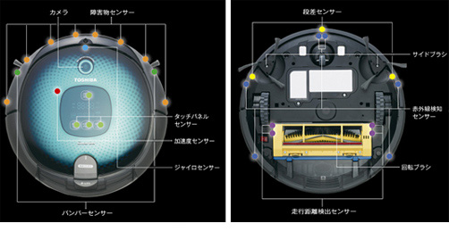 Toshiba built quite a few features into the robot, for example two CPUs (details unknown), a camera, and a set of 38 sensors (gyro, acceleration, range detection etc.). The company says that the Smarbo cleans an area of 100sqm in about 90 minutes and that electricity costs stand at just 2 yen ($0.03) for a room of that size.