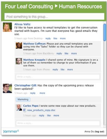 Using a JavaScript API, developers can add the Yammer Login Button to their applications via Yammer Connect. The Login Button eliminates the need for Yammer’s more than three million users to maintain multiple user profiles across business applications. So similar to the way you use Facebook Connect to log into consumer apps, Yammer Connect allows workers to authenticate business apps with their Yammer identity, and all of their profile details will automatically be completed. And users can share activity from third-party applications with colleagues back on Yammer.