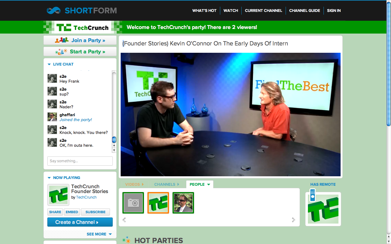 To give TC readers a taste of the Video Party experience, ShortForm has created a custom party focused on a TechCrunch-branded experience, in this case specifically Chris Dixon’s “Founder Stories”. Viewers can join each other, as well as the ShortForm staff, to watch a simultaneous stream of Dixon’s interviews. Of course, usually the host can pass the remote to other viewers, but in this case, it’s all Founder Stories, all the time. It’s a great example of how VJs, brands, and more will be able to customize their pages and their video experience to grab eyes, views, and maybe even dollars.