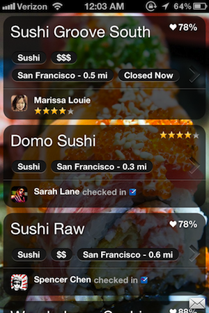 They can do this because they hook into Facebook, Foursquare, and Twitter (as well as a few other, smaller sources) to find signals about certain restaurants. Are people tweeting about liking them? Are users checking in there a lot? Those kind of things. This helps to determine what restaurants Ness should show to you within the app.