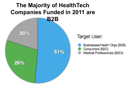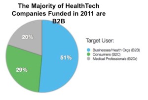 This is by far the number one reason why healthtech startups have failed. The findings from RockHealth’s study highlight an important dimension of this. On a positive note, 77 percent of VCs think healthcare IT investment dollars will increase in 2011. Already 35 digital health companies having received $2M+ in 2011. The important point is that 80% of those receiving funding are B2B (i.e., selling to either healthcare providers, businesses, etc.) yet the majority of digital health entrepreneurs surveyed think consumers will pay for their product or service. Despite this fact, most early stage digital health entrepreneurs are building B2C companies.