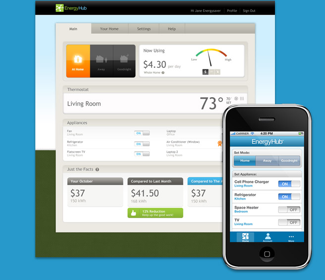 And when you’re away from home, the EnergyHub Web-based and mobile apps help you switch between the various modes and remotely control appliances.