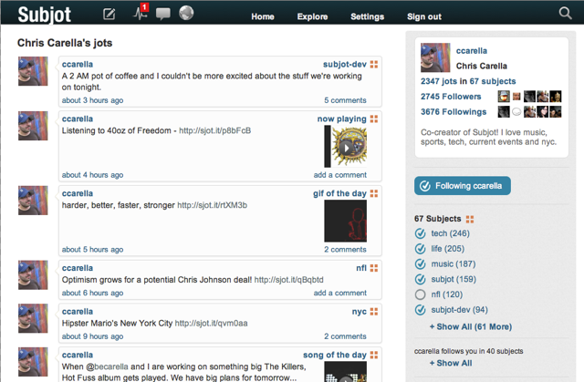 Subjot was created by husband-and-wife team Chris Carella and Becky Carella, who first came up with the idea last December and began working on it full-time in February. Mr. Carella says their inspiration initially came from Quora — they noticed how interesting topic-specific Quora threads often became, but that they were restricted because they’re in a Q&A format. Subjot is looking to open that idea up a bit more. You can get a sense for what a Subjot stream looks like by checking out Chris’s stream here. (My significantly more irreverent stream is here).