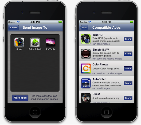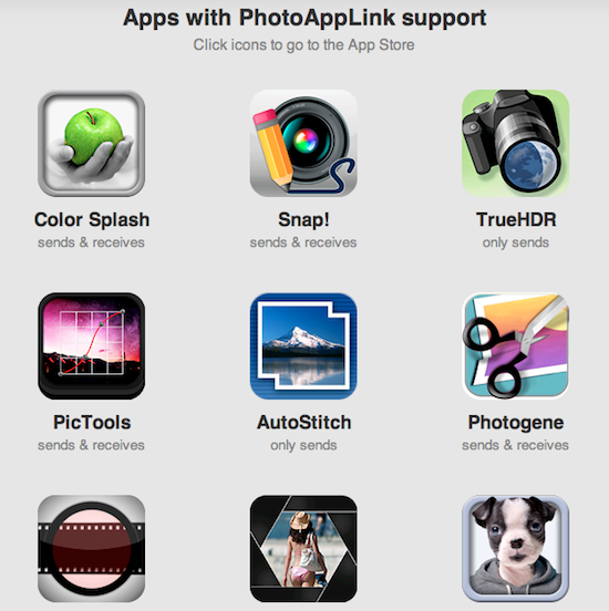 In order for this feature to work, a group of photo app developers got together and agreed to implement PhotoAppLink within their apps. Originally conceived by app development shops PocketPixels and CodeCrop, the feature is now live in Snap!, Color Splash, Simply B&W, PicTools, AutoStitch, TrueHDR, Juxtaposer, Click! and Photogene.