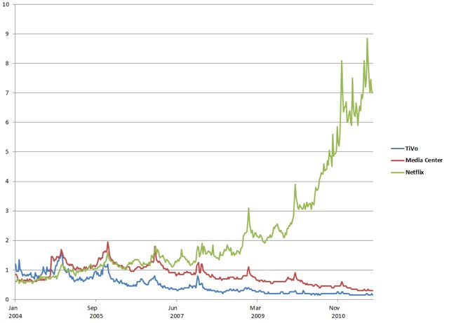 TiVo tried to make the TV smarter, but it too was outfoxed by the cable and satellite companies, who co-opted its DVR technology and stuck it in their own set-top boxes. Although TiVo is now forcing them to pay patent licensing fees, TiVo itself is in decline as a consumer brand. All you have to do is look at the chart below Ed Bott at ZDNet put together comparing searches for the term “Netflix” versus “TiVo” and “Media Center.”