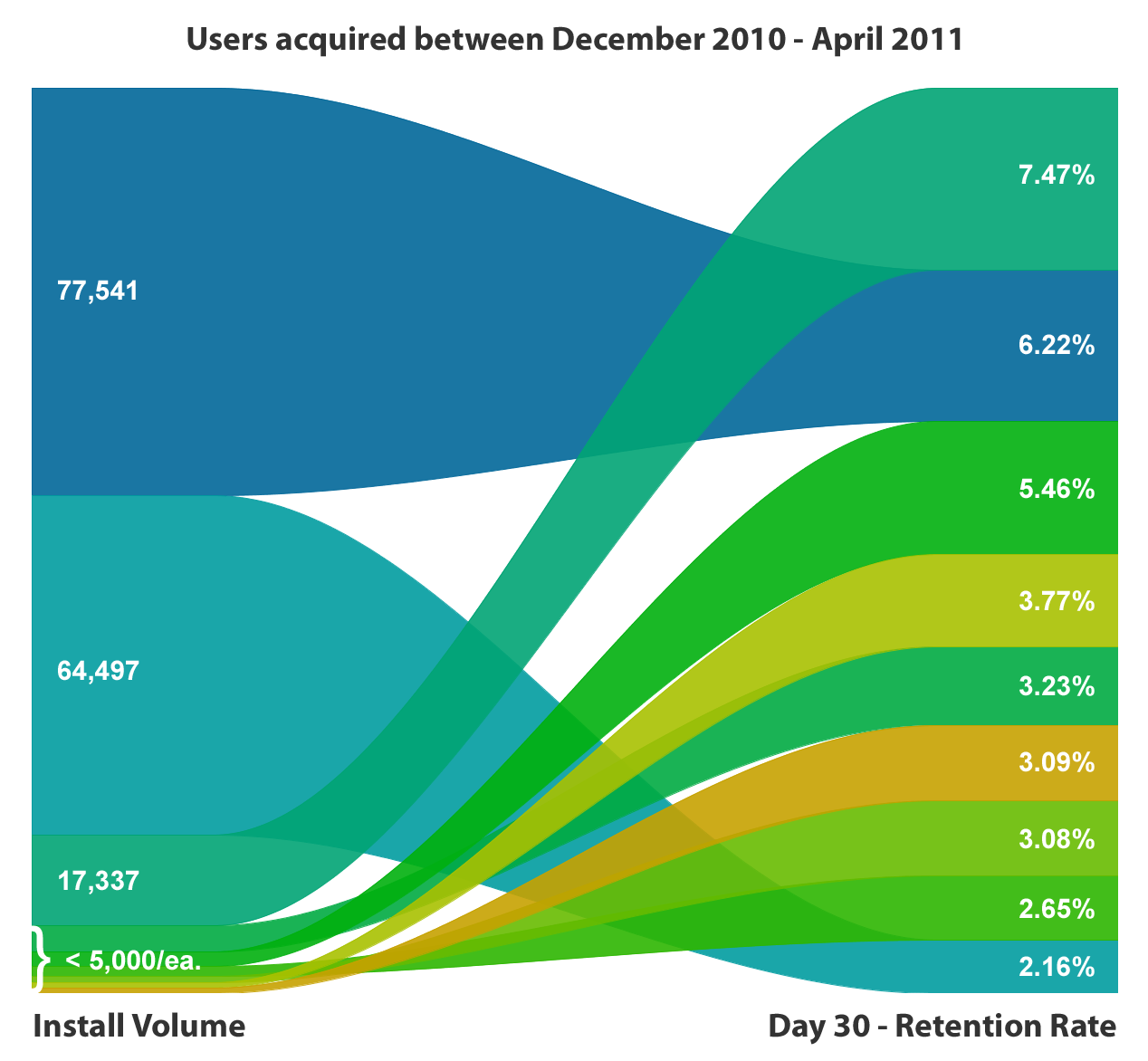 Between December 2010 and April 2011, W3i looked at the 30-day retention rates per traffic source for one of its burst campaigns for a popular game. It also calculated the volume per traffic source (see below chart, each color designates a different app).