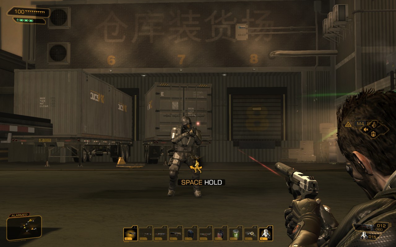The setup of the world and your means to get through it seem very arbitrary. It doesn’t always detract from the fun, but it was very clear to me that I was taking one of, say, three paths the developers put into the game. The incredible proliferation of unlocked air ducts leading straight to critical areas where enemies always look the other way makes you feel less like a ninja and more like just a guy taking “Path B.” You can still tackle things in your own way a lot of the time, but unlike effectively sneaking around in, say, Crysis, you don’t feel it’s because of any merit on your part.