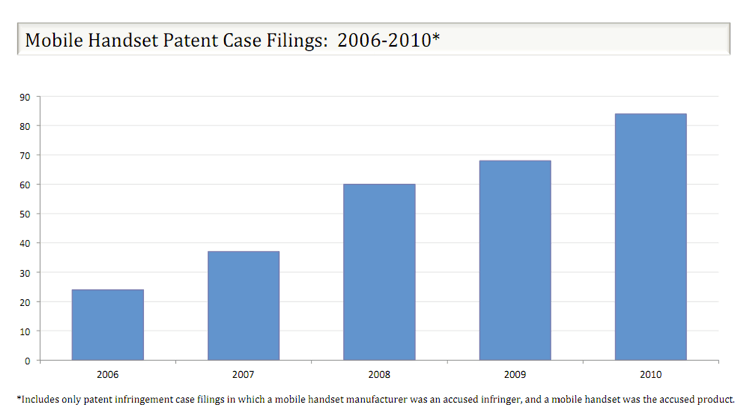 The company is just did a study on mobile handset litigation. According to Lex Machina’s data, mobile handset lawsuits are up roughly 25 percent a year since 2006. In fact, in August of 2011 alone, there were 294 patent lawsuits, 8 percent of which were mobile-related. Currently, Apple is involved in 97 open patent cases (here’s an example of one). Motorola Mobility is involved with 38 open patent cases.