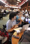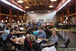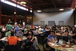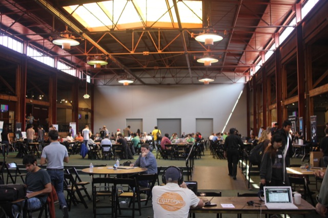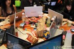 So far about half of registrants have made it into the venue, with the rest still signing in. Laptops are already fired up, hackers are putting their heads together, and the energy in the room is palpable. I’d guestimate that about 90 percent of the laptops in here are Macs, and the great majority of those are MacBook Airs. Apparently that’s the hacker’s notebook of choice. A full snack bar, shown below, is ready and waiting, though these guys seem much more preoccupied with getting their hack on.
