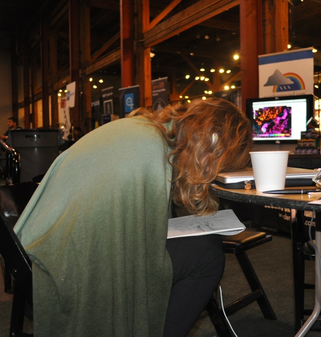 It’s been a solid 12 hours since the Disrupt Hackathon commenced, and things are getting a bit loopy. For the most part, this place is pretty quiet. We have a few sleepers in corners, and just about every cushy object in this building has been occupied. But the vast majority of hackers are wide awake, coding away.