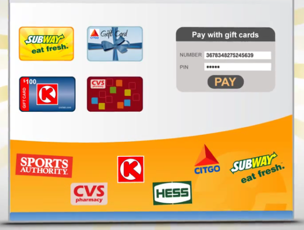To do this, the company is partnering with brands — they have six to start, including Subway, CVS, Circle K, Sports Authority, Hess and CITGO. If you buy one of these gift cards and head online to a supported site, you can use the card to purchase digital goods. You can spend whatever value was stored on the card — there’s no exchange rate that depends on where you bought it. You enter the number on your gift card, hit submit, and you’ll get a receipt for the transaction, just like if you had used a credit card.