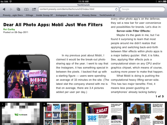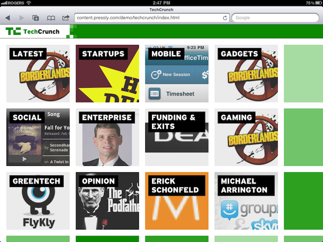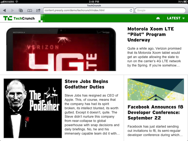 TechCrunch Disrupt finalist Pressly is an HTML5-based platform that turns online publications into tablet-friendly websites that work on the iPad, Android tablets or the BlackBerry PlayBook. The sites it produces are nearly indistinguishable from their native counterparts, like Flipboard and Zite for example, offering a similar experience for browsing through articles, images and videos. Navigation is designed for the tablet interface, using common gestures like multi-touch swipes and pinches.