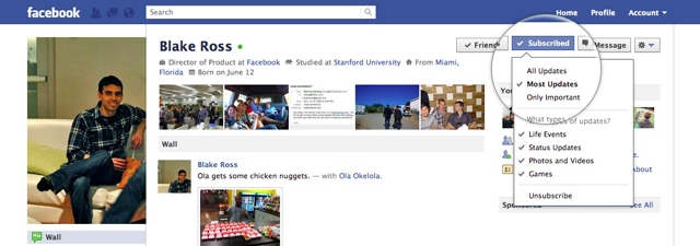 In addition to Subscriptions, Facebook is also making it easier to tweak the amount and types of content that show up your News Feed. Now, when you’re viewing a user’s profile, you’ll be able to hit a button and choose from three subscription settings: