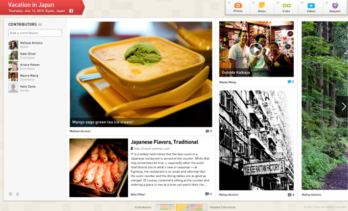 Collection is a single place for you and your friends to aggregate and share content around experiences. Using a tool, a group can collaborate to build an album of photos, links, updates, and more. As Feng explains, it’s a living, breathing place on the web around an experience, sort of like a Wikipedia page for a trip, or an IMDB movie page for an event.
