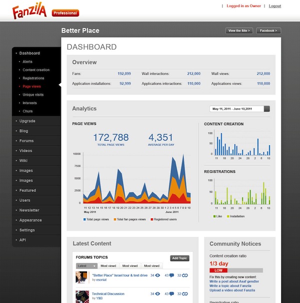 In addition to the aforementioned apps for blogging, forums, contests, etc., Fanzila pages can also include a video portal, wiki site, photo galleries, Twitter feeds and more. On the back-end, advanced analytics provide Fanzila’s users with business intelligence on their fans’ engagement and interactions. The system identifies and tracks relevant fans activities on Fanzila apps and the Facebook page (e.g., likes, comments, churn, fans leaders, etc.)