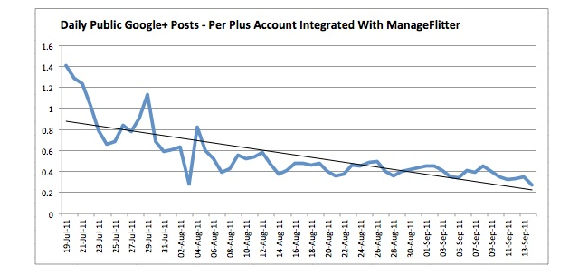 According to its data, the average number of public – i.e. not private – Google+ posts per day has decreased from 0.68 per day between 19 July 2011 and 19 August 2011 to 0.40 public posts per day between 19 August 2011 and 14 September 2011.