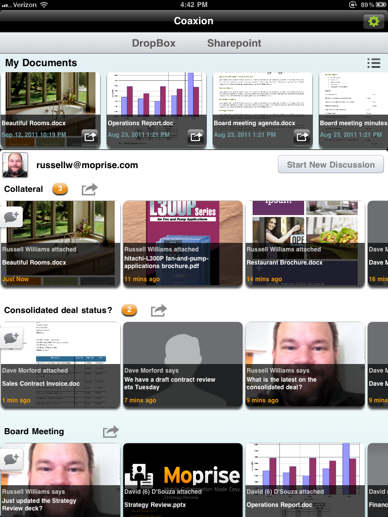 Moprise is launching a new iPad application it’s calling a “Flipboard for the Enterprise.” The app is a tablet-optimized version of the company’s currently available Coaxion iPhone application. The Flipboard analogy isn’t quite right, however. Flipboard is about reading news and articles, browsing photos and viewing updates from your social networks in a magazine-like format. Coaxion and Flipboard are only similar in that they both have easy-to-browse, touchable, swipe-friendly user interfaces. But Coaxion’s content is corporate documents, not news or tweets.