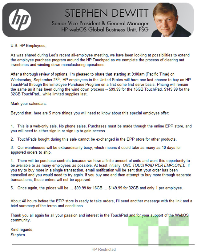 The company is set to release a final batch of the $99/$149 HP TouchPads to employees starting September 28th at 9:00am PDT. This is per an email I received from an HP employee (embedded after the jump), which notes TouchPads are available on a first come, first serve basis and employees are only allowed to buy one TouchPad — which some will likely list on ebay where TouchPads are currently selling for over $200. The sun is setting on the TouchPad’s life and HP is likely ready to move forward, thoroughly burned by their venture into the land of the iPad.