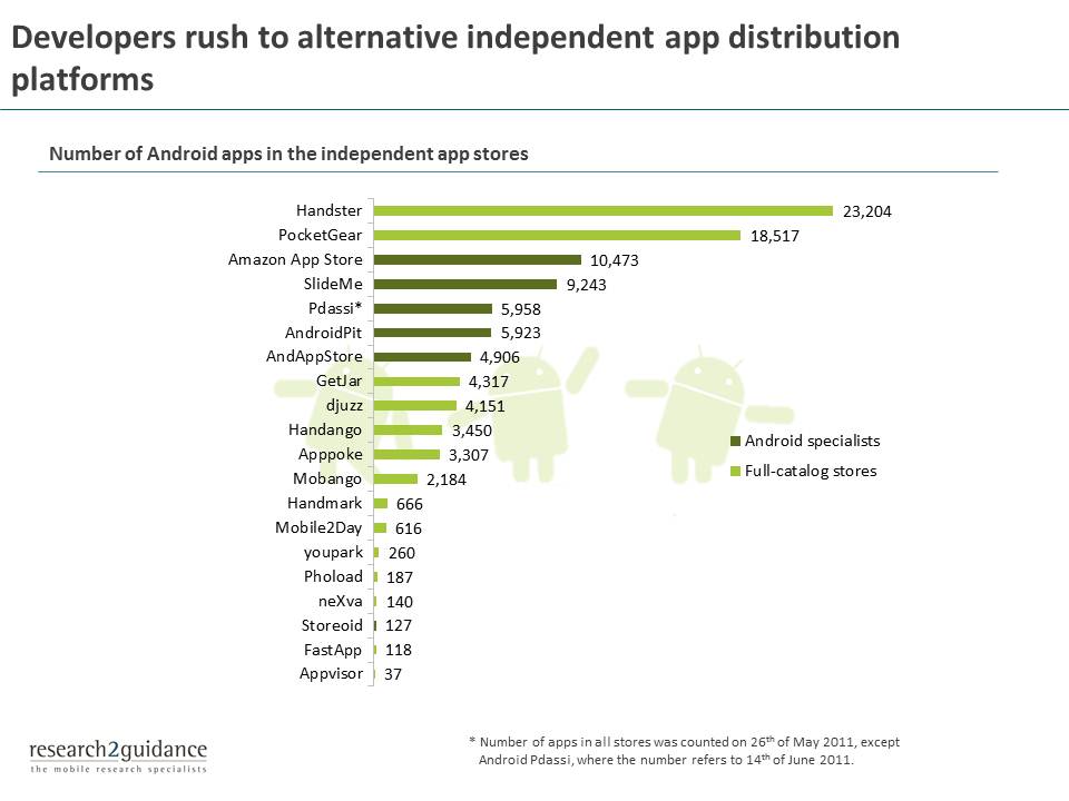 According to a recent report by Research2Guidance, Handster was the leading third-party application store for Android apps, beating out PocketGear, Amazon’s App Store, GetJar, and a dozen other popular brands. At the time of the report (June 2011), Handster hosted nearly 23,000 apps, with 2,500 more added each month.