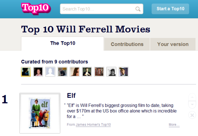 Top10 basically enables people to create and share recommendations (evidently, in the form of Top 10 lists) about products, entertainment, travel and other topics, in an effort to crowdsource the online population’s opinions on the Web and thus help people make informed purchasing decisions.
