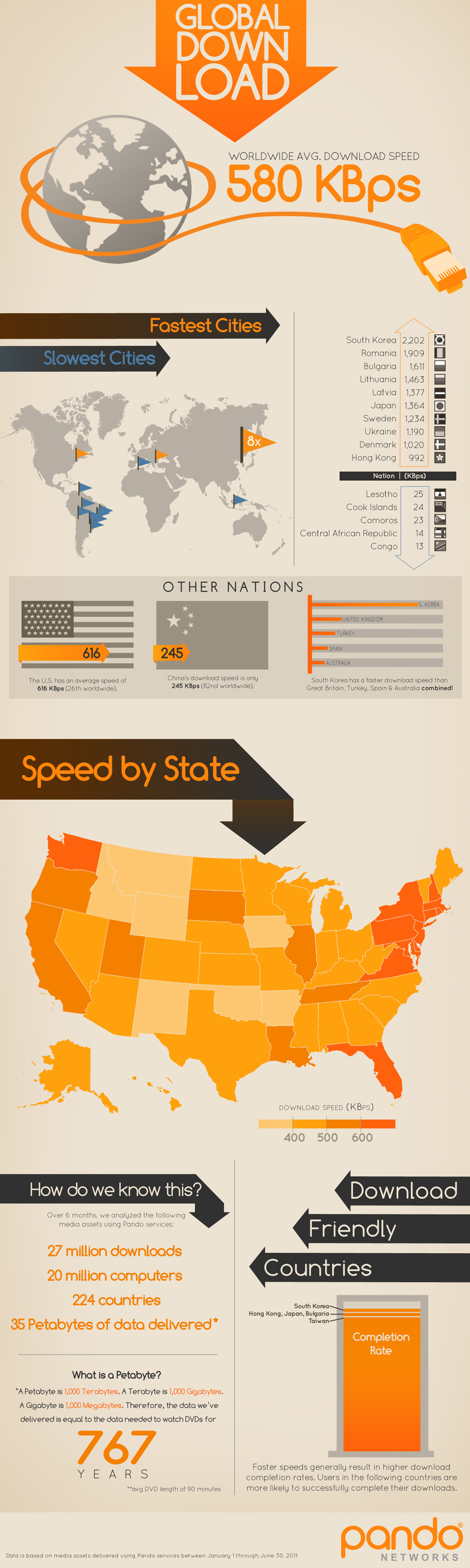 Today, Pando Networks has released another study that reveals the speed and reliability not just of the U.S. but of the global landscape in an attempt to provide a comprehensive look at the accessibility of the world’s data. Interestingly, the average global download speed is 580KBps, showing among other things that Idaho’s speed pales in comparison to worldwide average. But what may come as a surprise to some is that the U.S. ranked in at 26th with an average speed of 616KBps, compared to South Korea, the world speed champion, which came in with a blinding average speed of 2,202KBps.