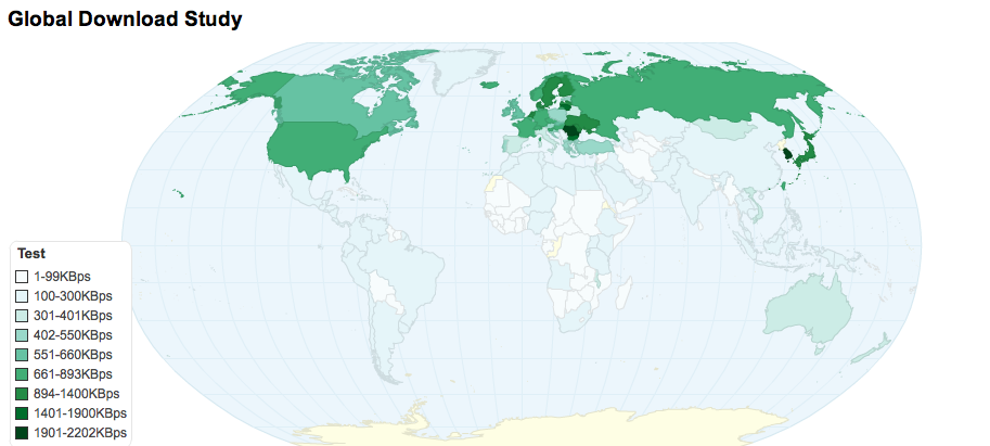Developing nations in Africa and Asia unsurprisingly brought up the back of the pack, with the Congo showing the slowest average speed at 13KBps, the Central African Republic at 14KBps, and Comoros at 23KBps. (Other countries of note include China at 245KBps and Australia at 348KBps.)