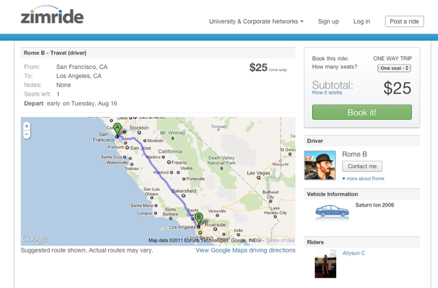 Zimride is currently used in 120 different networks, each of which connects users belonging to the same university of business. Through the platform, students and employees can can arrange to either carpool to work/class, or to coordinate one-off rides. For example, if I were planning to drive from San Francisco to Los Angeles, I could sell each of my extra seats. Zimride’s founders say that that trip actually runs around $40 per seat — which means it isn’t tough to actually make money on those long drives. To give an idea as to how much traction the service has within each network, Zimride says that Facebook is on the platform and that 35% of its employees are using the service.