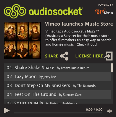 Powering the nuts, bolts, and backend of the Vimeo Music Store will be Audiosocket’s Music-as-a-Service (or MaaS) platform, a cloud solution designed to allow digital media companies to easily integrate music search, discovery, and licensing. The Vimeo Music Store, which represents the first commercial implementation of Audiosocket’s solution, will allow users to take advantage of all the benefits of a music library that contains more than 100 categories of integrated metadata, all from inside the friendly confines of Vimeo’s platform.