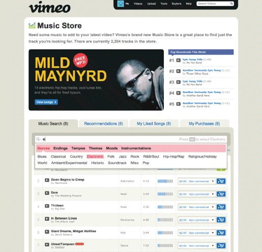 At F8 on Thursday, The Social Network will by all accounts be making its official foray into music, with scrobbling and music content galore headed straight for our news feeds. Ahead of Facebook’s new music service, Vimeo is announcing its own musical news, thank you very much, that has some interesting implications for artists and filmmakers and music technology. You may know Vimeo as the quality YouTube alternative that’s long been a place for semi-pro videographers, filmmakers, and Vloggers to host, share, and present their video content. Today, Vimeo is taking its long-awaited leap into the music world with the “Vimeo Music Store” — a custom-designed music licensing solution that will allow Vimeo’s video buffs to search for, discover, and license songs for both non-commercial and limited commercial use.