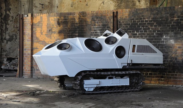 Berlin-based artist Nik Nowak has created an actual track-based vehicle, as in a tank, with over a dozen speakers on it. Built on the frame of a Japanese industrial dumping vehicle, Panzer is the final answer in the boombox wars.