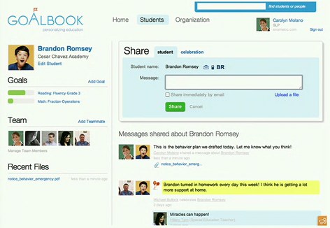 (4:33) The disconnect between group-based teaching and individual learning is addressed by Goalbook, which hopes to produce for every student a single, shared learning plan. The alternative, parent-teacher conferences and counselor meetings, is totally out of date, and simple social networking tools can improve the situation significantly, in their opinion. Instead of a file in a cabinet somewhere and a few notes jotted on attendance sheets or classwork, every student is a node in a network of educators, administrators, and parents. A database of goals, strategies, and so on will be used to create a recommendation engine for helping students. They’re launching in a number of Bay Area districts and private schools.