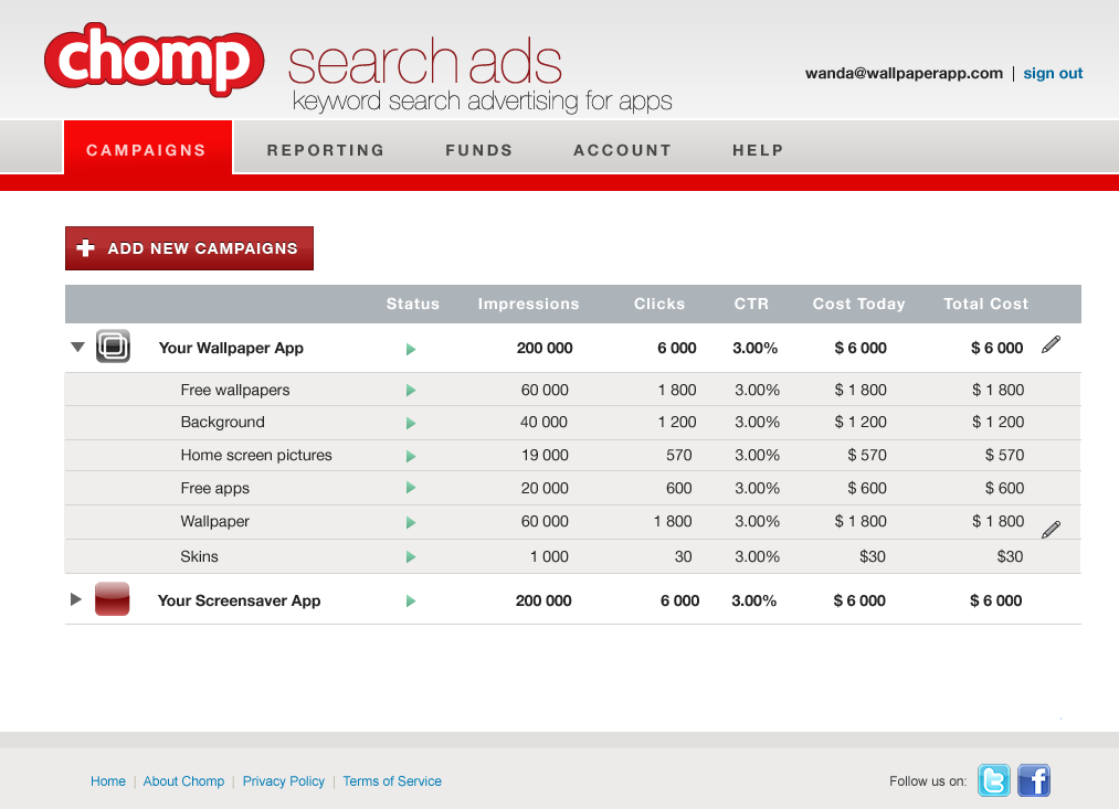 Chomp will then show ads based on bid price and relevancy, with developers’ accounts being charged only when users click on the ad through a “Get It” button. And, just like Google does for web advertising, the startup will provide users with campaign reporting and analytics to measure the effectiveness of their ad dollars.