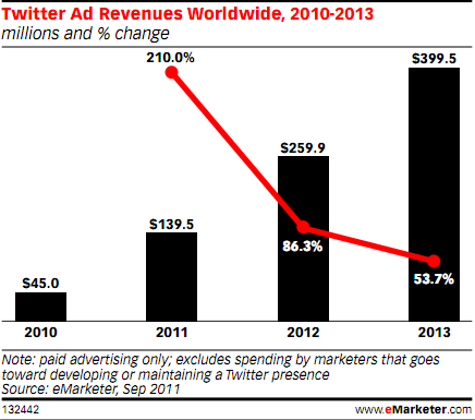 As Twitter CEO Dick Costolo told the media a few weeks ago, advertising is a key strategy for the company. “Our advertising method is the only one we need to be a big business,” he said at the time. And Twitter has rolled out a number of new products including Promoted Tweets. But according to a new eMarketer report, Twitter’s ad revenue is expected to be lower this year, and will grow significantly over the next few years once the platform’s self-serve ad product rolls out. eMarketer estimates global ad revenues at Twitter will grow 210% to $139.5 million in 2011, up from just $45 million in 2010, in the company’s first full year of selling advertising.