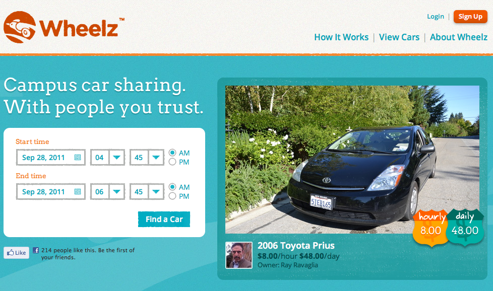 Kicking it into fifth gear and zooming out of stealth and into the public sphere today is Wheelz, a new person-to-person car sharing platform for campuses — designed to connect students who have cars with student who need ’em. Granted, when I first heard the basics on Wheelz, I immediately thought, “gadzooks, another car sharing platform!?” What about RelayRides, GetAround, Zimride, and Zipcar? These are all by and large great young businesses, adding value to the space; sure they’re not all targeting campuses, but I wasn’t so sure we needed another one.