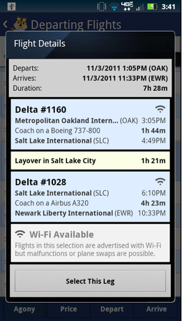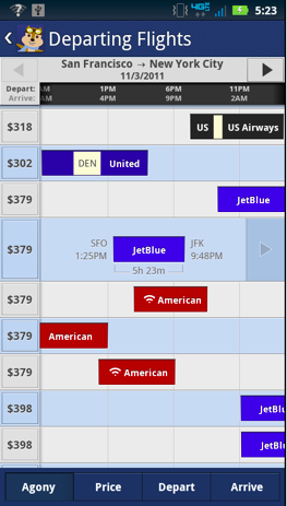 I’ve tested the app and it looks great (it’s a nice reminder that Android apps can be slick and well designed, even if a lot of them aren’t…). And it works just as you’d expect: enter your destination, departure/arrival dates, and choose from coach, business or first class. The app will present Hipmunk’s grid of flights, which you can sort by Agony, Price, and Time. Oh, and all flights carrying life-sustaining Wifi are clearly labeled with nice orange icons.