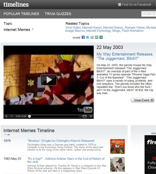 Timelines.com is a website that basically allows people to record and share personal or historic events, and contribute descriptions, links, photos and videos related to those events, people, companies, bands and whatnot (i.e. Cuban Missile Crisis, Al Capone and Pink Floyd).