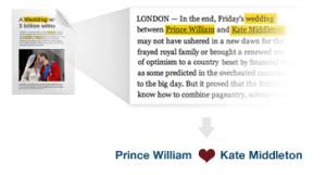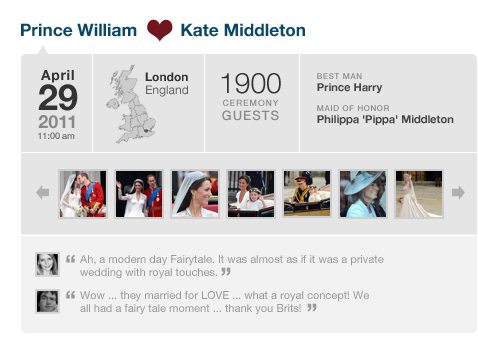 In this case, the headline was distilled down to just the event, categorizing what’s happening into the actors (i.e., Prince William, Kate Middleton) and the verbs (i.e., married), displayed with a universal icon.