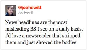 For example, when Kate Middleton married Prince William, you could read a thousand articles about it. Oddly enough, reading traditional print media is actually more efficient than this, because the story is mentioned only once per paper. In the current state of “overload”, you see the same article tweeted, shared on Facebook, pushed to your RSS feed, etc. And in many cases publishers bend to the perverse incentive of sensationalized headlines to differentiate their cookie-cutter content and drive more clicks. This makes it difficult to avoid bias and understand what’s actually happening, or even know if you’ve already read the story before clicking the headline: e.g., Kate Middleton gets coat of arms, It’s Official, Their Perfect Day.