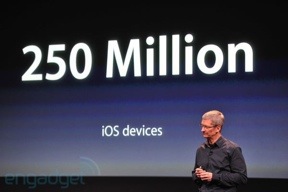 Perhaps more impressive is the fact that Apple has sold 250 million iOS devices. That’s iPhones, iPod touches, and iPads — and we’ll do a breakdown of those sales numbers later. The iPhone 4, he says, makes up more than half the iPhones they’ve sold, and is the number one smartphone in the world.