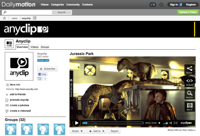 Starting today, Dailymotion users will gain access to AnyClip’s library of over 50,000 clips, from major movie studios such as Universal Pictures, Vivendi Entertainment and several indie distribution firms. To get a taste of what they have to offer, check out their list of most popular clips.