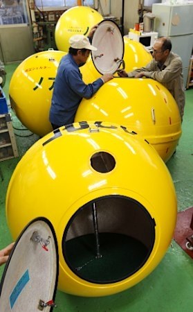These balls, made by Cosmo Power, cost a few hundred thousand yen and can be used as a Tsunami shelter. It seats four (small) adults and can double as a teeny, tiny playhouse for kids until needed.