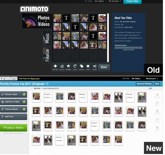 The startup also says that the creation flow has been tweaked to fit up 300 media tiles on a screen, to cater to some of the consumer and professional power users of Animoto who use dozens of photos and/or video clips to create long video slideshows. The old creation flow only showed 30 media tiles on the screen at one time, but with hundreds of tiles in one screen, developing these longer slideshows is simpler.