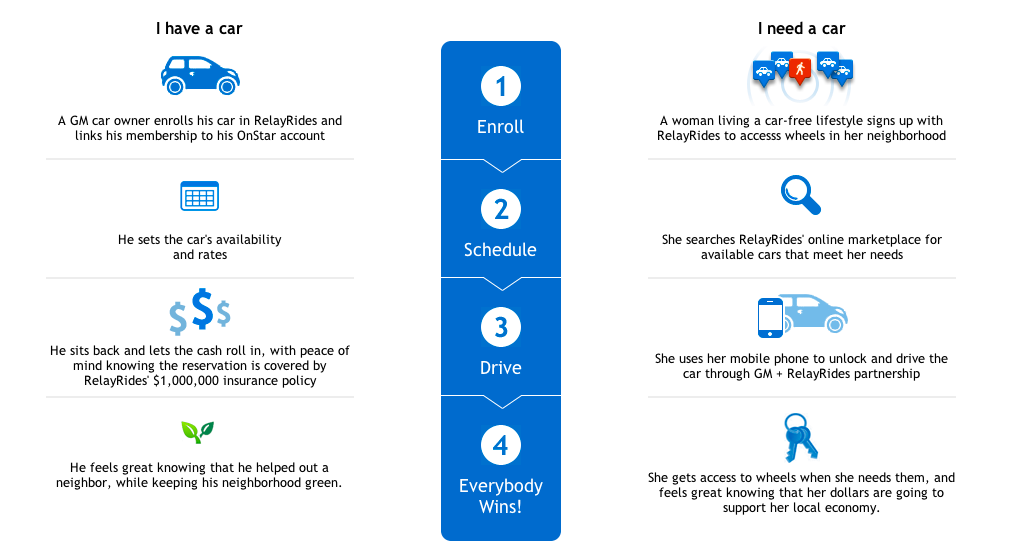 RelayRides, a peer-to-peer car-sharing marketplace lets auto owners choose to rent out their car when they’re not using it, with the car’s owner controlling the rate and availability through the online service.