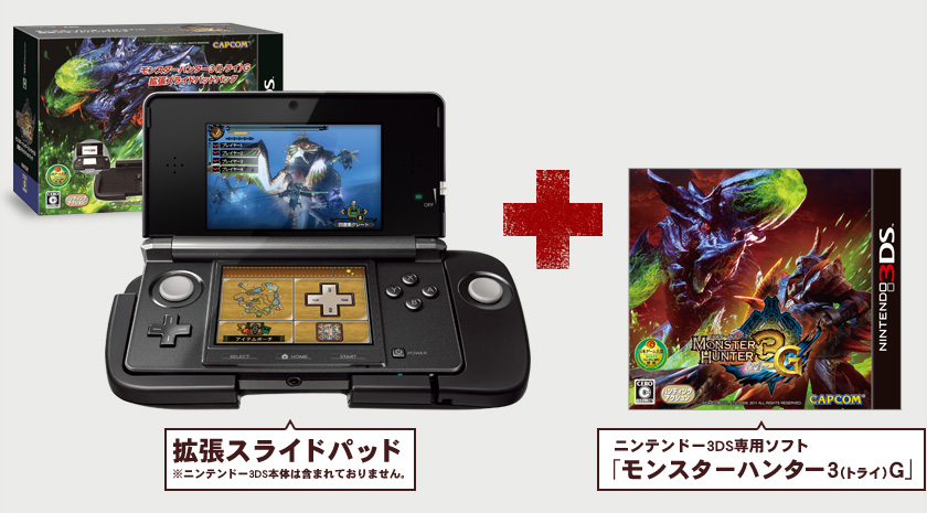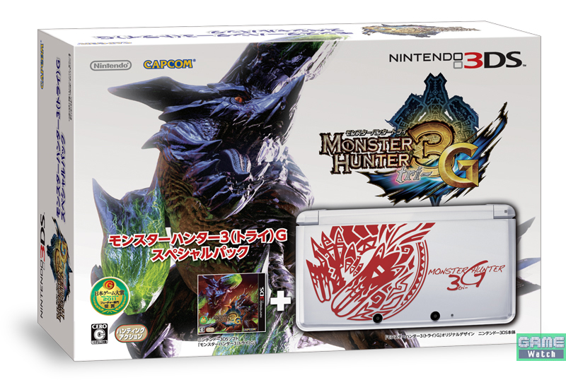 Second, Capcom Japan announced [JP] the so-called “Monster Hunter 3G Special Pack”, which includes a 3DS in white and special design and Monster Hunter 3G. The bundle will hit Japan on December 10 for US$274.