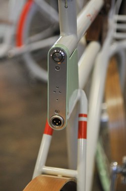 The front wheel has a hub motor powered by that battery underneath the seat there. The battery can be quick-charged at an outlet and are actually the same kind found in the Chevy Volt. The porteur-style front rack has been brought into the 21st century with a removable flat-rack that attaches or detaches in seconds by means of spring-loaded bolts, and the fronts of the support tubes conceal a pair of LED headlights. The rack is mounted on the frame, not the fork, which improves stability. I’ve always been a fan of paniers but this works nicely as well. Reminds me of this bent-wood bike basket. Core77 has a nice design diary for the project, and IDEO has a page for it as well.