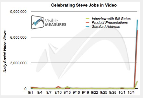 Wow. In the wake of the sad news of Apple co-founder Steve Jobs’ passing, the videos featuring his inspiring speeches and presentations have seen jaw-dropping amount of views. One of Jobs’ most famous and more recent speeches, the commencement speech at Stanford University in 2005 averaged 2,000 daily views in September. Yesterday, the speech saw over 8 million views, according to Visible Measures.