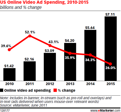 In 2011, forecasters are projecting U.S. online video advertising revenues of $1.9 billion to $5.6 billion. I emailed Forrester, Magna Global, eMarketer and Accustream and obtained the following information: