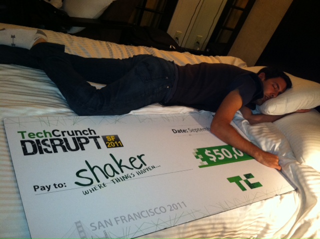Shaker, the Israeli startup that won Disrupt SF less than a month ago, is raising a hefty $15 million series A. The round is being led by Menlo Ventures, with good-karma VC Shervin Pishevar doing the deal. Michael Arrington’s CrunchFund is also an investor, along with Eric Schmidt’s Innovation Endeavors, Lady Gaga’s manager Troy Carter, and Pitango Venture Capital. (The picture at right is one of the Shaker founders crashing with the $50,000 Disrupt winner’s check, which wasn’t part of the round, I just love the picture).